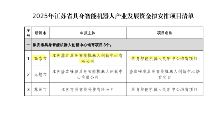 日前,江苏省工信厅发布2025年度具身智能机器人产业发展资金拟安排项目公示,由江苏鼎汇具身智能机器人创新中心有限公司申报的“具身智能机器人创新中心培育项目”成功入选。