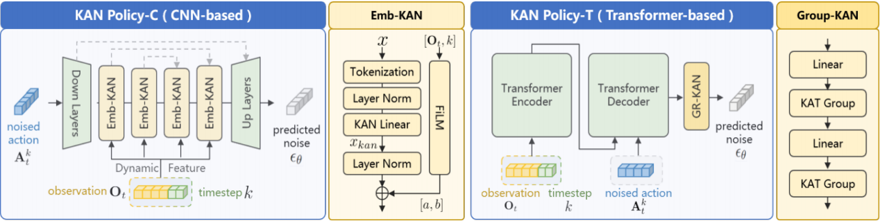 KAN Policy (KP) 以主流的扩散策略为基础框架,但其核心革新在于用KAN替换了传统网络中的关键组件。与传统网络使用固定的激活函数不同,KAN的网络连接本身就是可学习的、由样条曲线构成的函数。这种设计使得整个网络本质上是连续的。团队针对不同架构专门设计了: