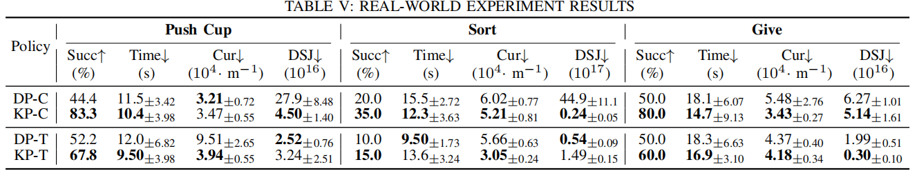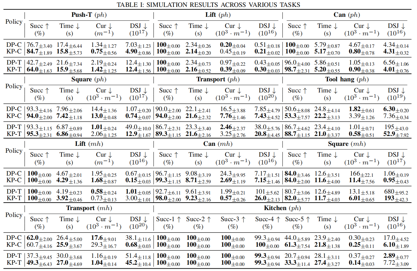 团队在七个模拟任务和三个真实世界机器人任务中进行了广泛实验。结果表明,受益于其连续的结构设计,KAN Policy的综合性能显著提升,在模拟和真实世界实验中,平均成功率、执行效率和轨迹平滑度均大幅超越基线模型。尤其是在真实机器人上,成功率平均提升了53.8%,平滑度提升了29.4%。
