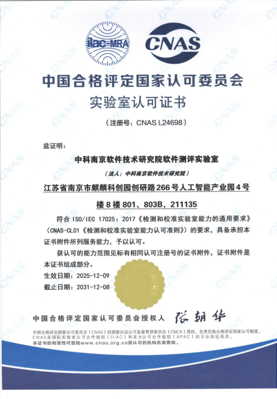 此次取得CNAS认可,标志着研究院软件测评实验室在管理规范性与检测可靠性上已达到国家权威标准,亦彰显了研究院在软件检测技术创新与质量管理方面的深厚积淀与整体实力。展望未来,实验室将进一步强化能力建设,深耕前沿软件理论探索与关键技术攻关,依托“源图”持续提供专业、公正、高效的软件测评及相关技术服务,为我国软件产业的高质量发展贡献力量。