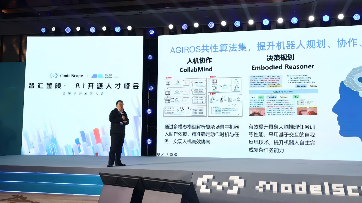作为峰会重点环节,魔搭社区联合CCF智能机器人专委会等权威机构,正式发布EAI-100(Embodied Artificial Intelligence 100)具身智能年度百项代表性成果与人物榜单。EAI-100榜单作为具身智能领域的权威风向标,系统梳理了年度内推动行业发展的核心力量,涵盖先锋人物、技术突破、开源项目等八大板块。EAI OpenSource 10 具身智能·年度10大开源项目榜单旨在评选过去一年中对具身智能领域的社区产生重要价值的开源项目及可持续演进的开源生态。AGIROS智能机器人操作系统开源社区凭借在智能机器人开源生态方向的创新贡献一举入选。