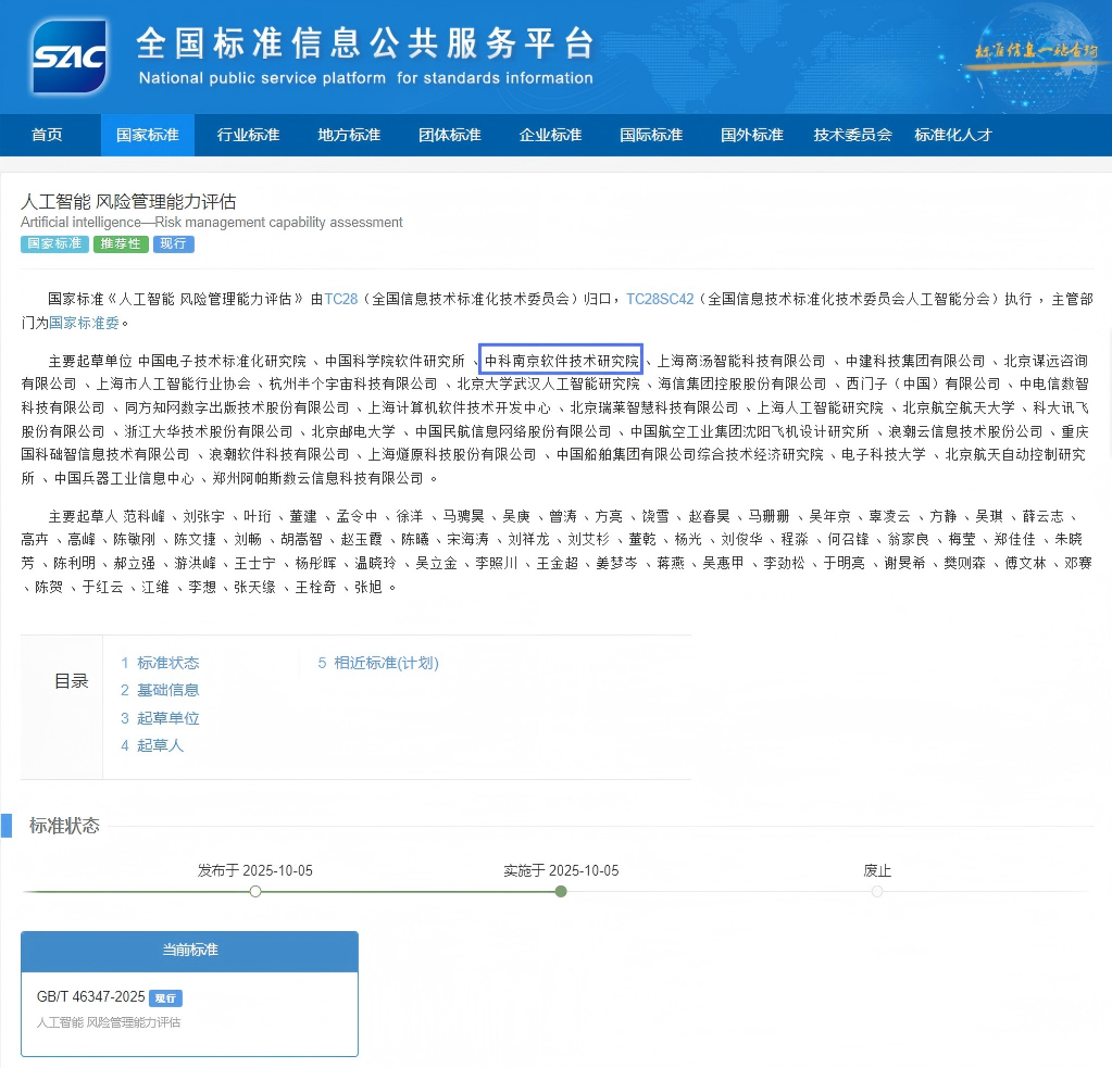 】【近日,国家标准《人工智能 风险管理能力评估》(GB/T 46347-2025)正式发布,自2025年10月05日实施。中科南京软件技术研究院是该标准的主要起草单位。
